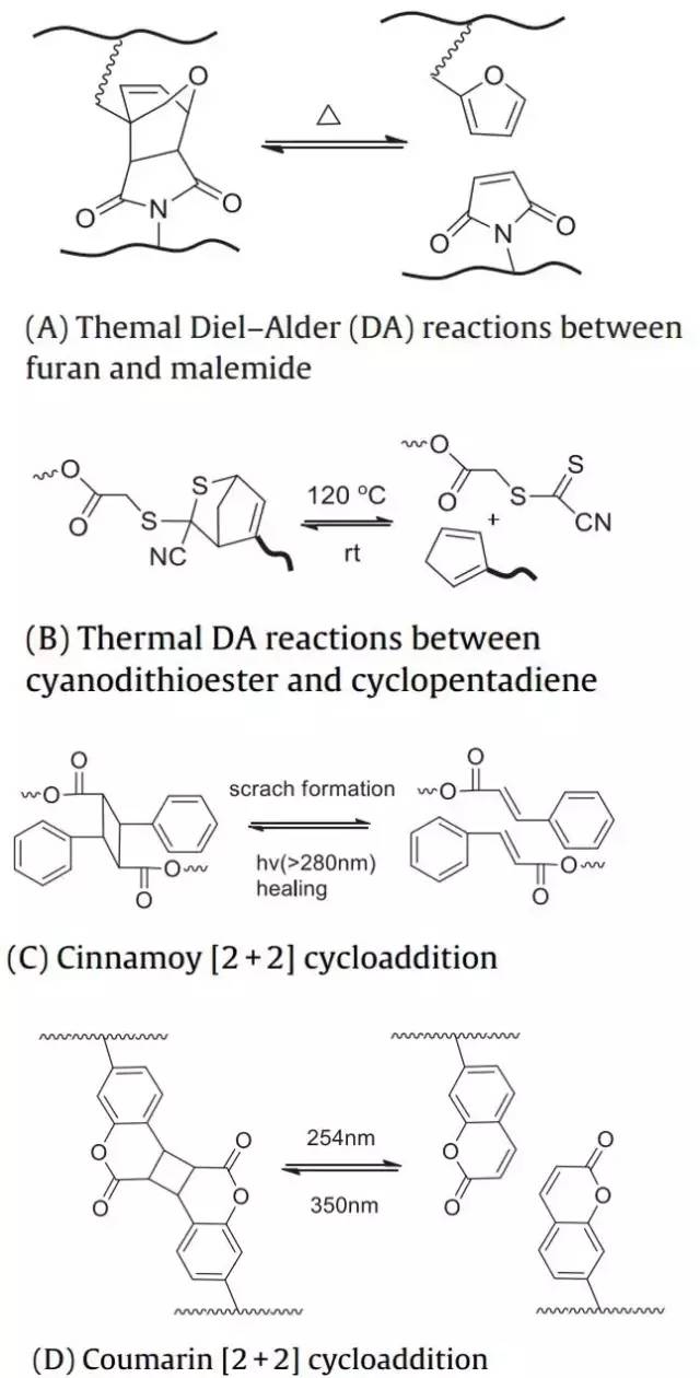 这方面经常使用的就是一些动态共价键。包括并不限于DA反应、自由基反应等等。典型的动态共价反应如下: