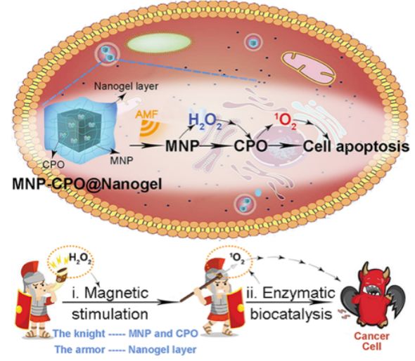 有鉴于此,结合PDT和SDT的物理可活化特性以及EDT的有效酶促生物氧化作用,同济大学王启刚教授联合成昱教授课题组提出了一类新型的载有酶的磁性纳米凝胶,MNP-CPO@Nanogels,作为一种可活化和程序控制的嗜中性粒细胞模拟物,通过上调细胞内1O2进行的癌症治疗,称为磁热酶串联疗法(METT)。